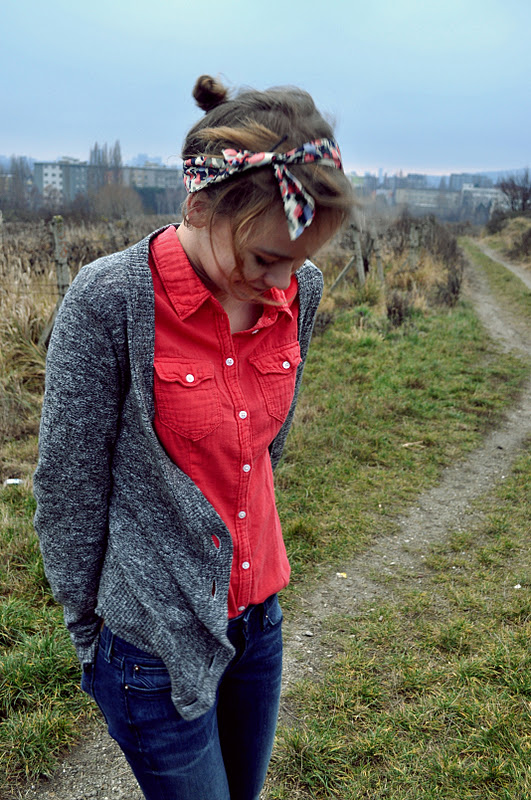 Anyways, here are some new outfit photos. I'm wearing my sister's cardigan with orange shirt and floral headband (all from H&M). I feel like this grey comfortable thing is one of those you can throw over everything. What do you think of it? :)